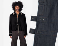 The Autumn / Winter 2023 collection takes inspiration from the dark Scandinavian winters, when daylight is at its minimum and colours fade into hues of blue, black, and grey. Structures and patterns are hardly visible, only lightened by the glow of the snow, moon, and stars. As always, all garments are produced in Europe and all fabrics and trimmings are made of natural materials such as horn, mother of pearl, and coruzo.