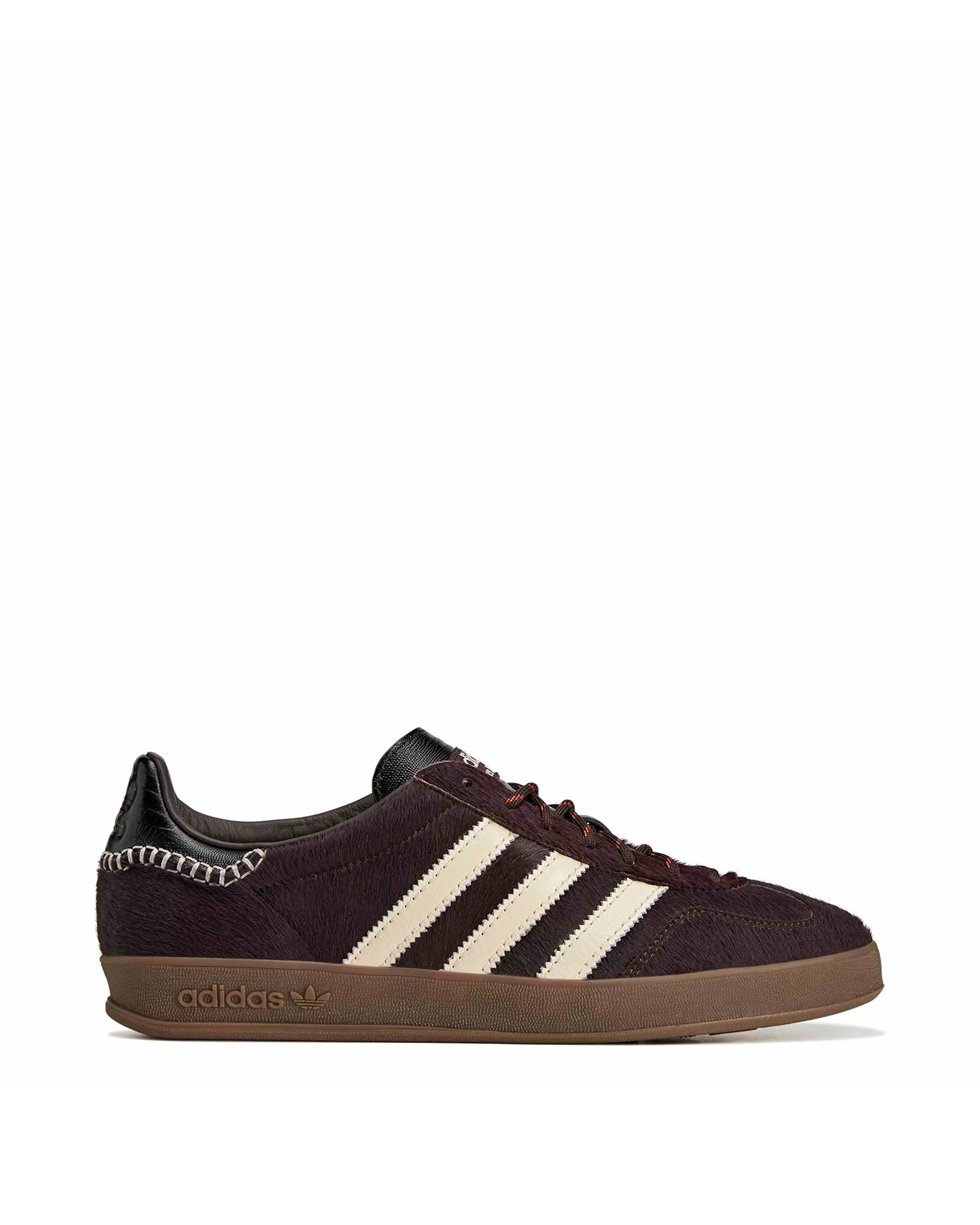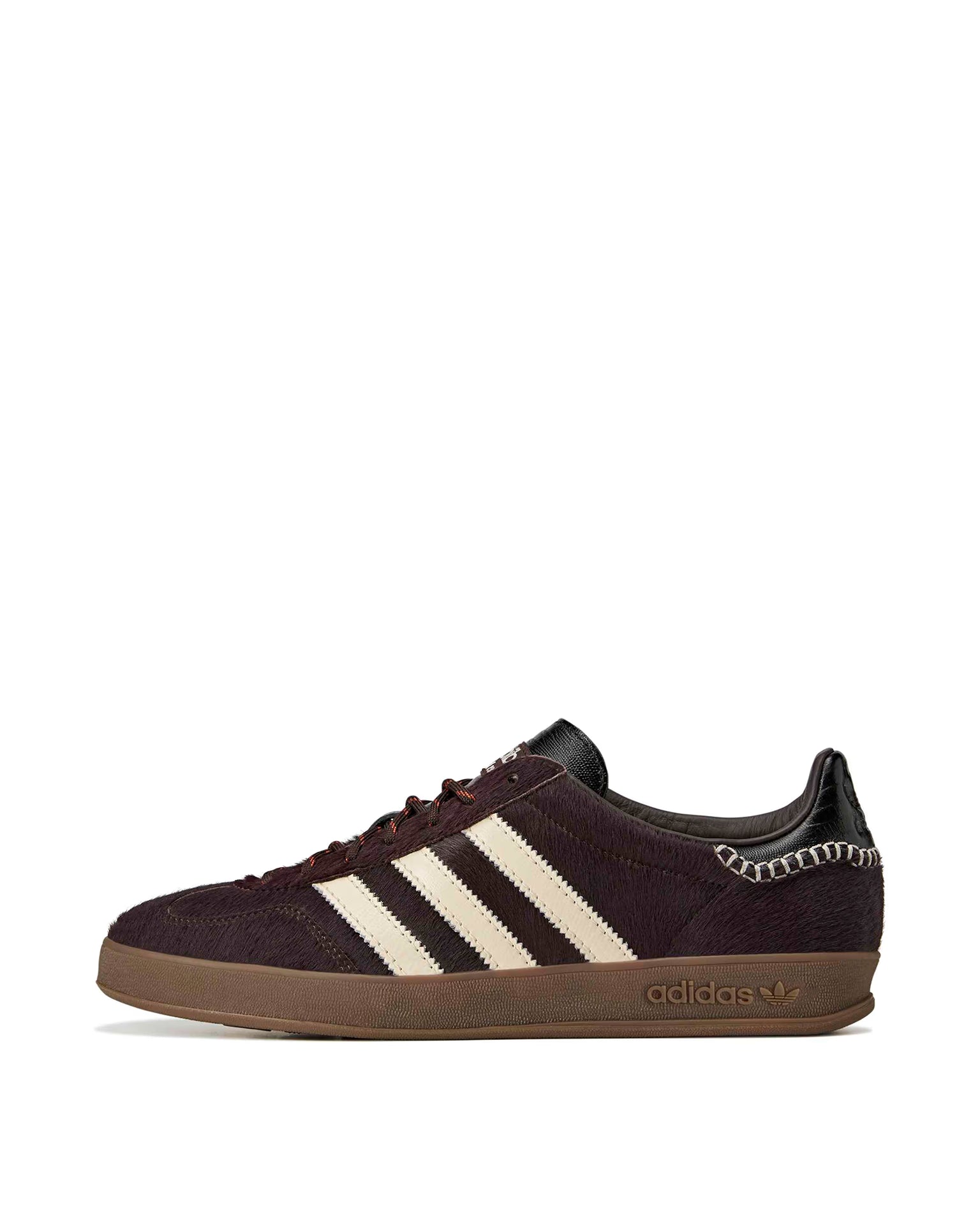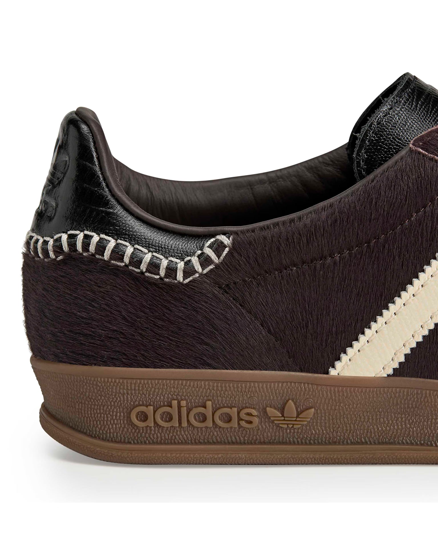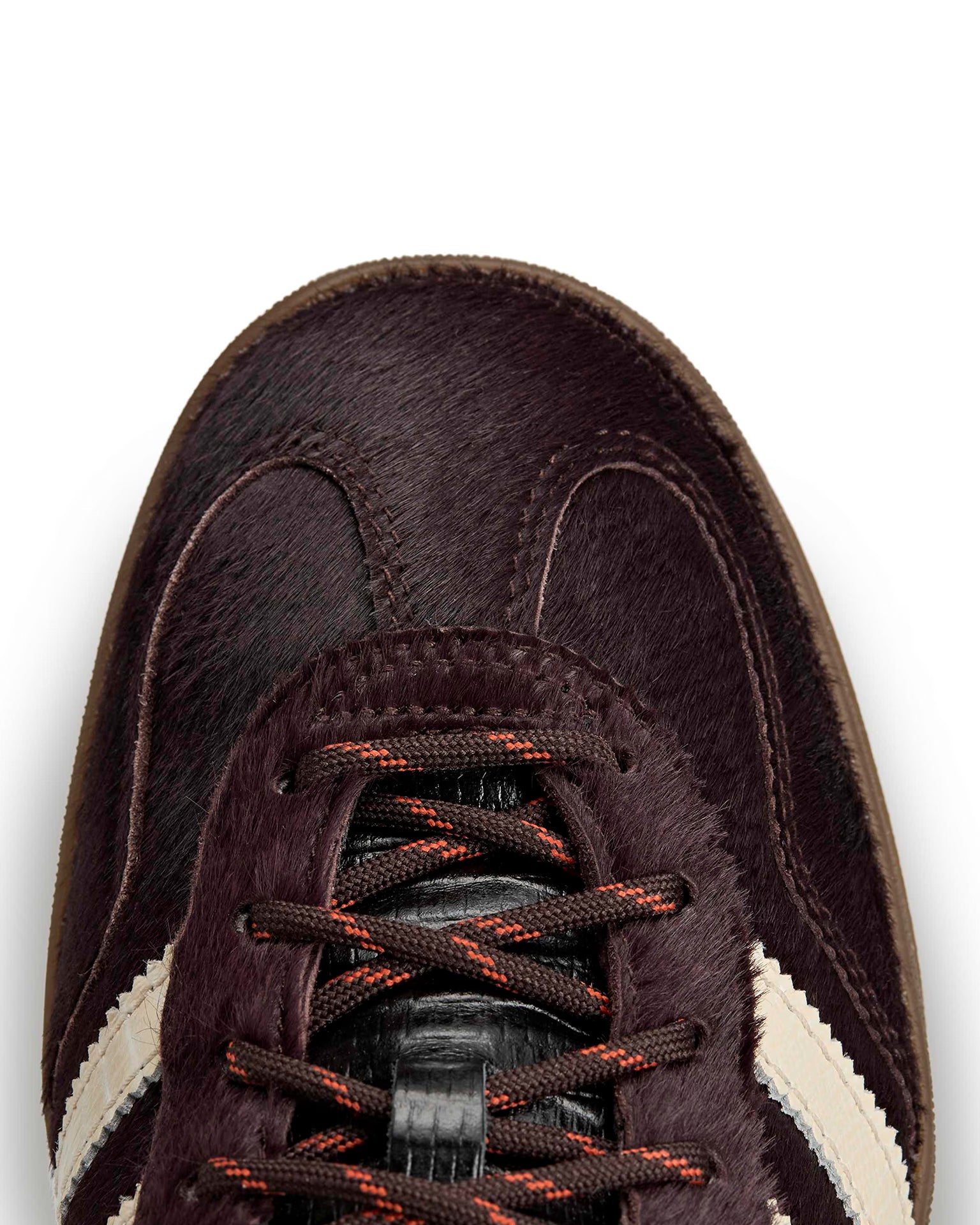 The adidas x Wales Bonner Gazelle Pony comes in a low profile shape with a brown pony hair upper, contrast three stripes in bordeaux and off white, and a black heel tab with visible whipstitch detailing. Lacing sits over a black tongue, while the sole is finished in brown rubber. This pair is made in Vietnam and finished with a leather upper and rubber soles by adidas.