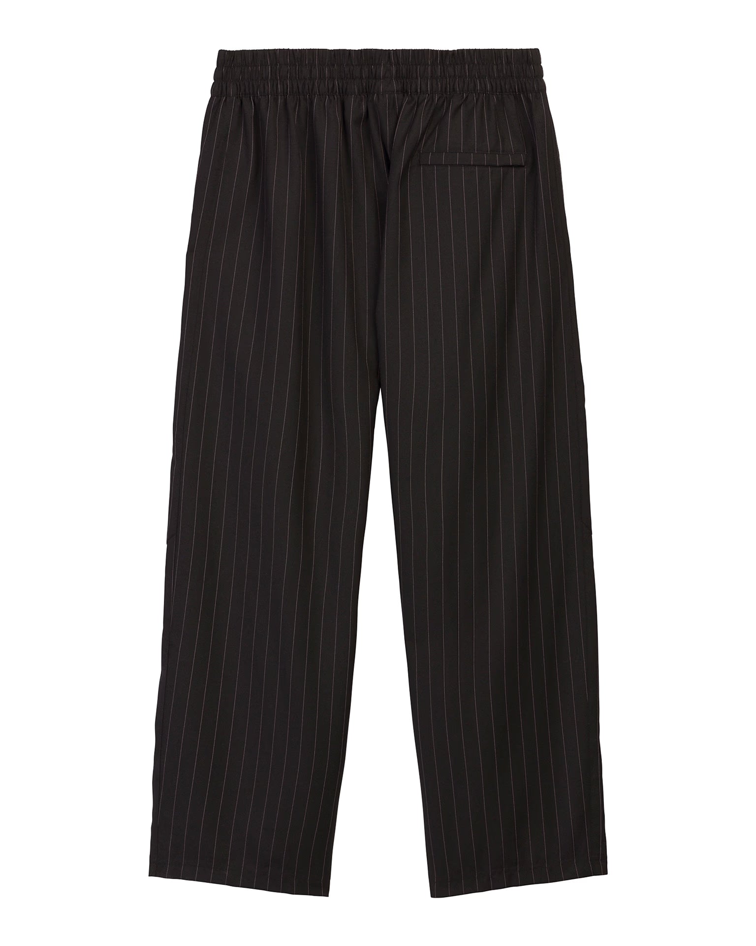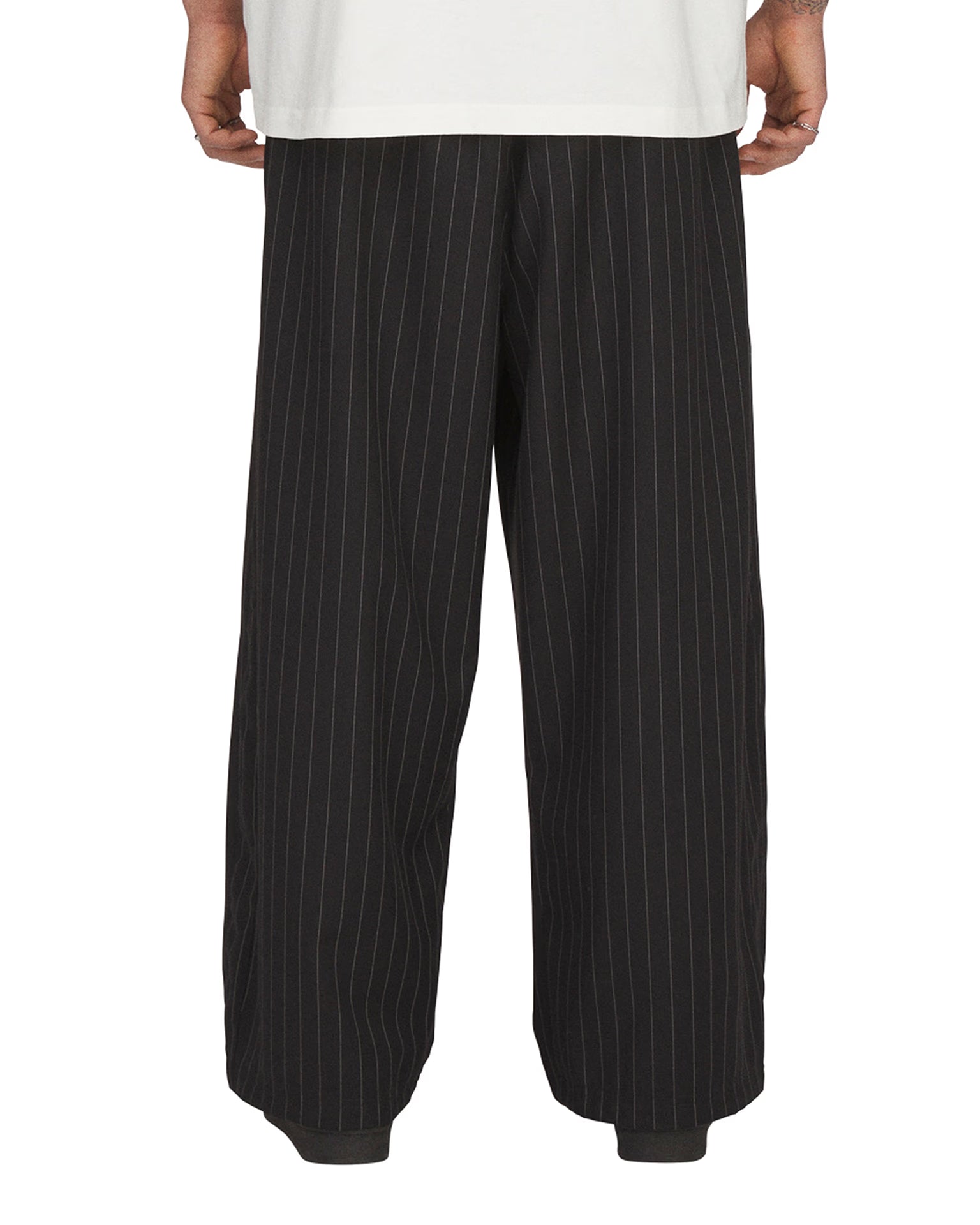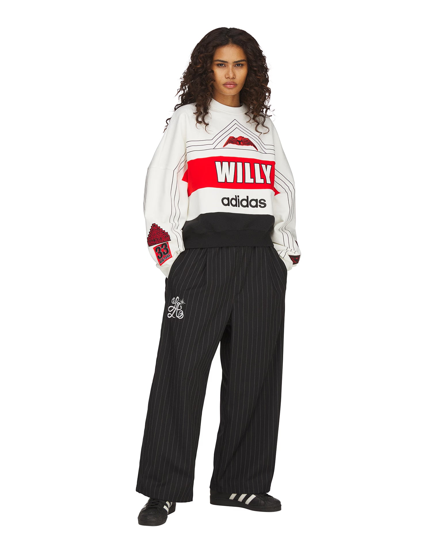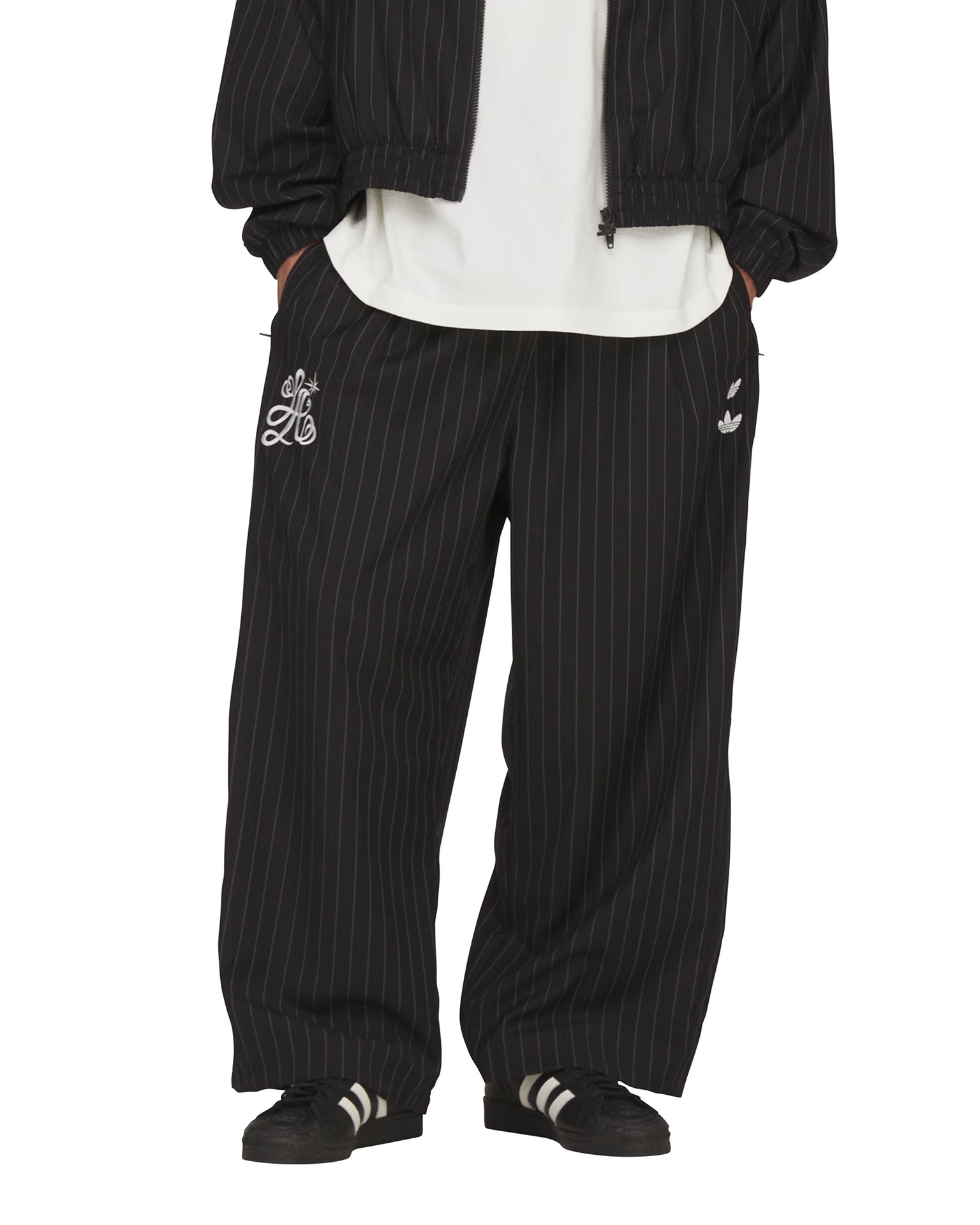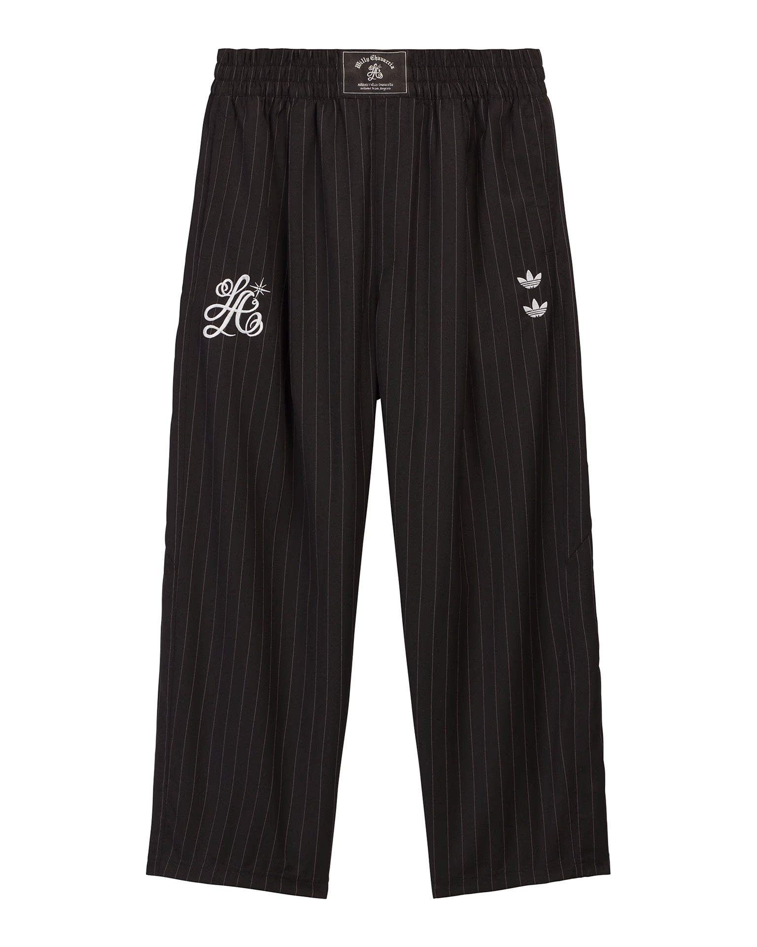 These black pinstripe track pants from adidas are cut from premium wool suiting with a fine vertical stripe and voluminous proportions through the leg. Double front pleats build extra volume and drape, anchored by a fold-over elastic waistband with drawcord. Two side pockets with zip closures are set into the seams, complemented by a discreet hidden pocket in the side seam and a single welt back pocket on the wearer’s right side. Embroidered double Trefoil logos on the left thigh, an LA graphic on the right thigh and a stitched Willy Chavarria jock tag at the front waistband define the collaborative detailing.