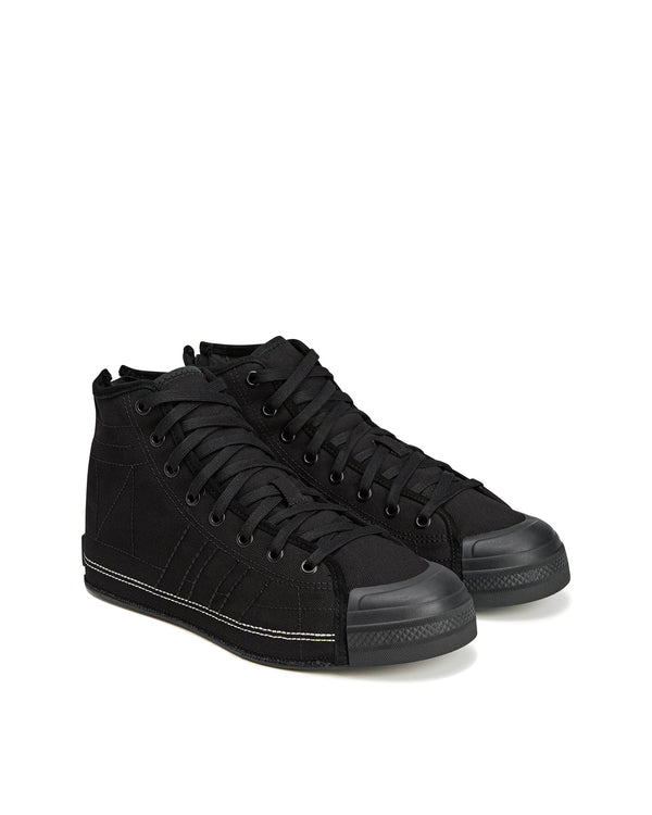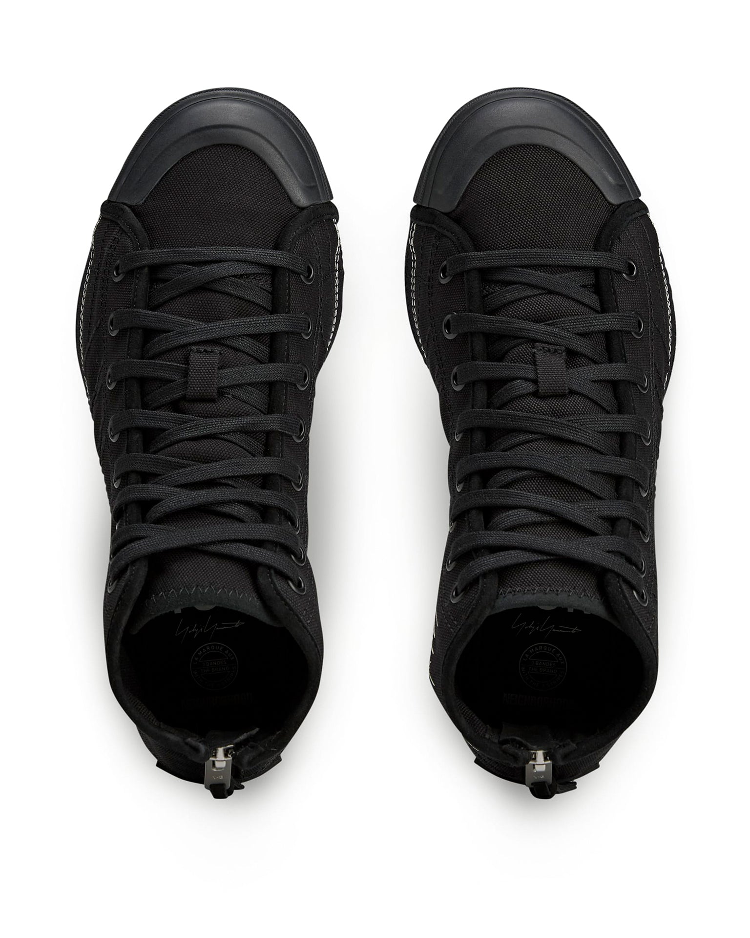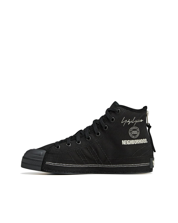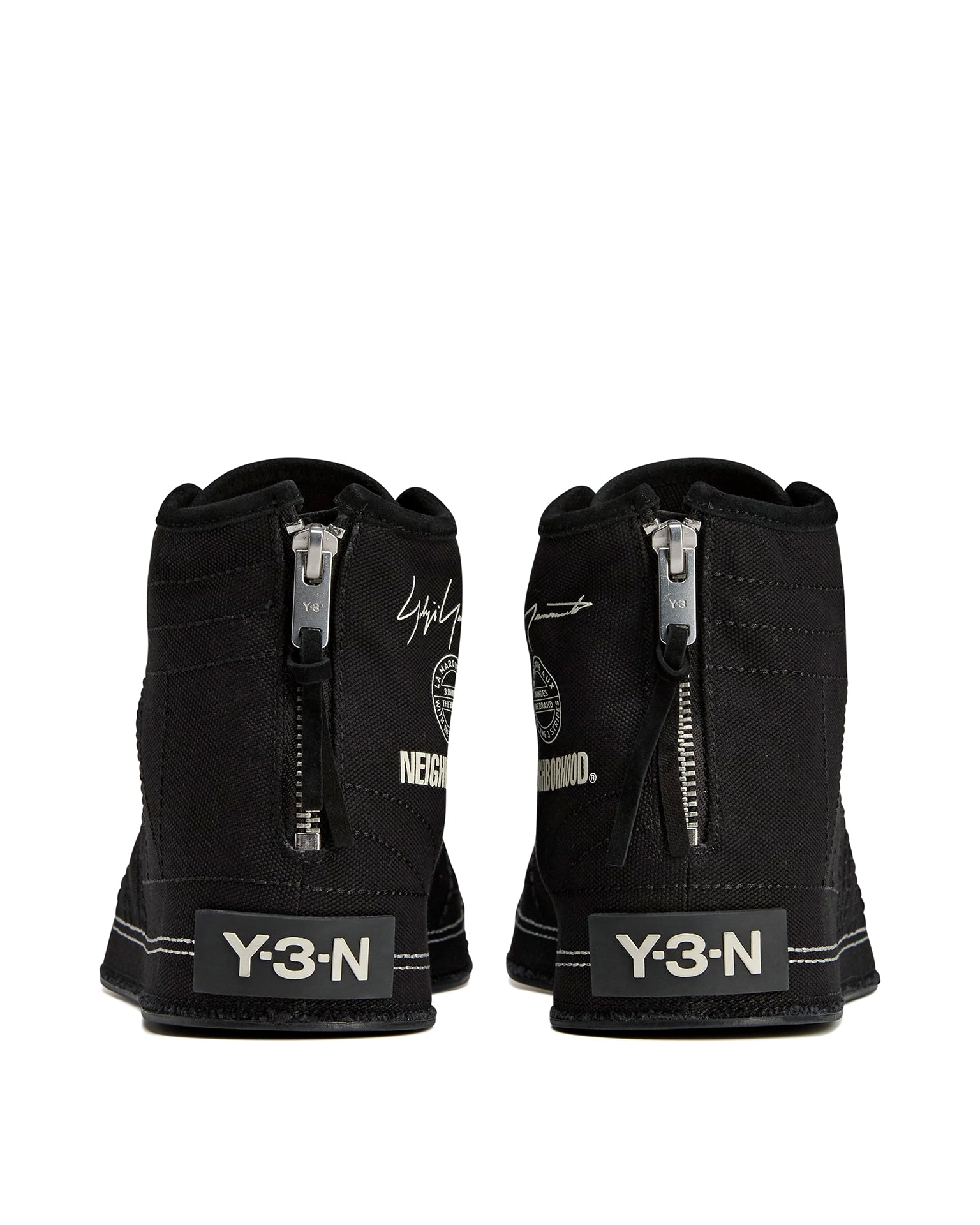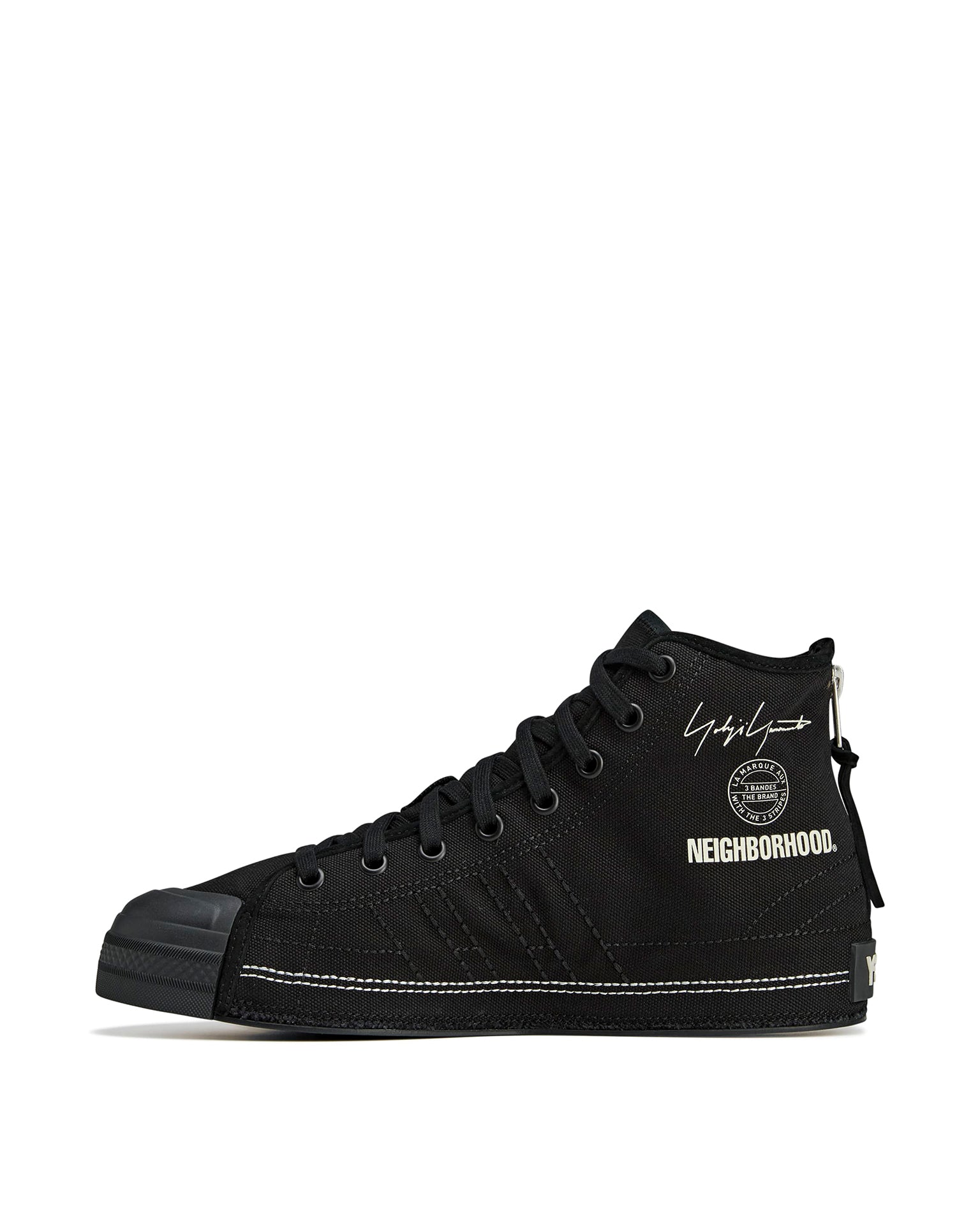 Y-3 once again disrupts adidas DNA to bring us a reimagining of sport style, now in collaboration with renowned streetwear brand NEIGHBORHOOD. The Y-3-N Nizza Hi Shoes are constructed with a canvas upper that extends all the way to the outsole, showing off frayed edges in signature Yohji Yamamoto style. A removable Lightstrike midsole insert adds running shoe-like responsiveness, while a heel zip offers easy access. The three-way collaboration is celebrated by a stacked logo graphic on the medial side of the shoe, "N" deco stitch on the lateral side, a graphic on the leather sockliner, and finally, a "Y-3-N" wording detail on the rubber heel patch