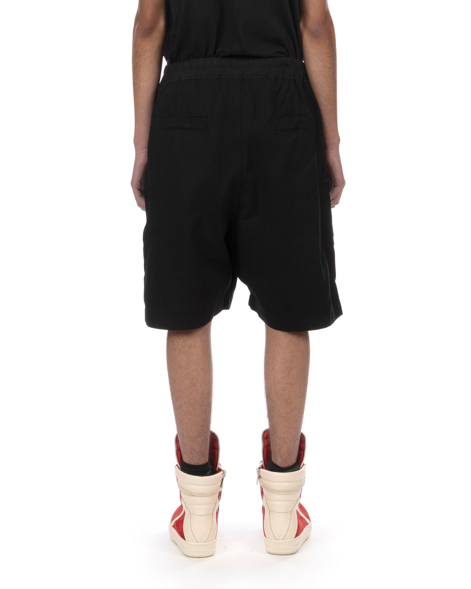 The shorts feature an elasticated waistband with an adjustable drawstring, accommodating a range of waist sizes. The silhouette is relaxed with a dropped crotch and sits above the knee. For fit guidance, refer to the size chart or contact us via the DRKSHDW by Rick Owens product enquiry page.
