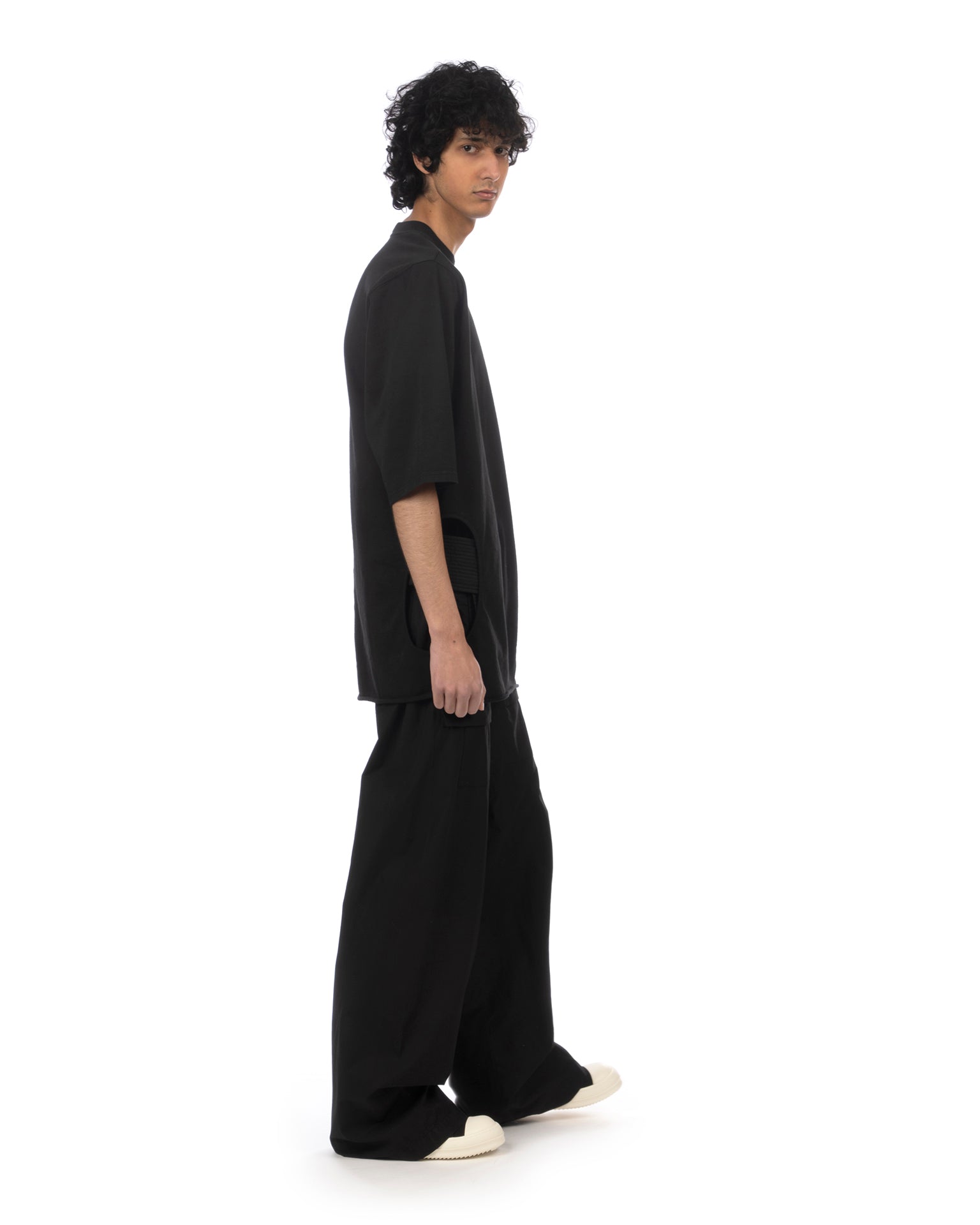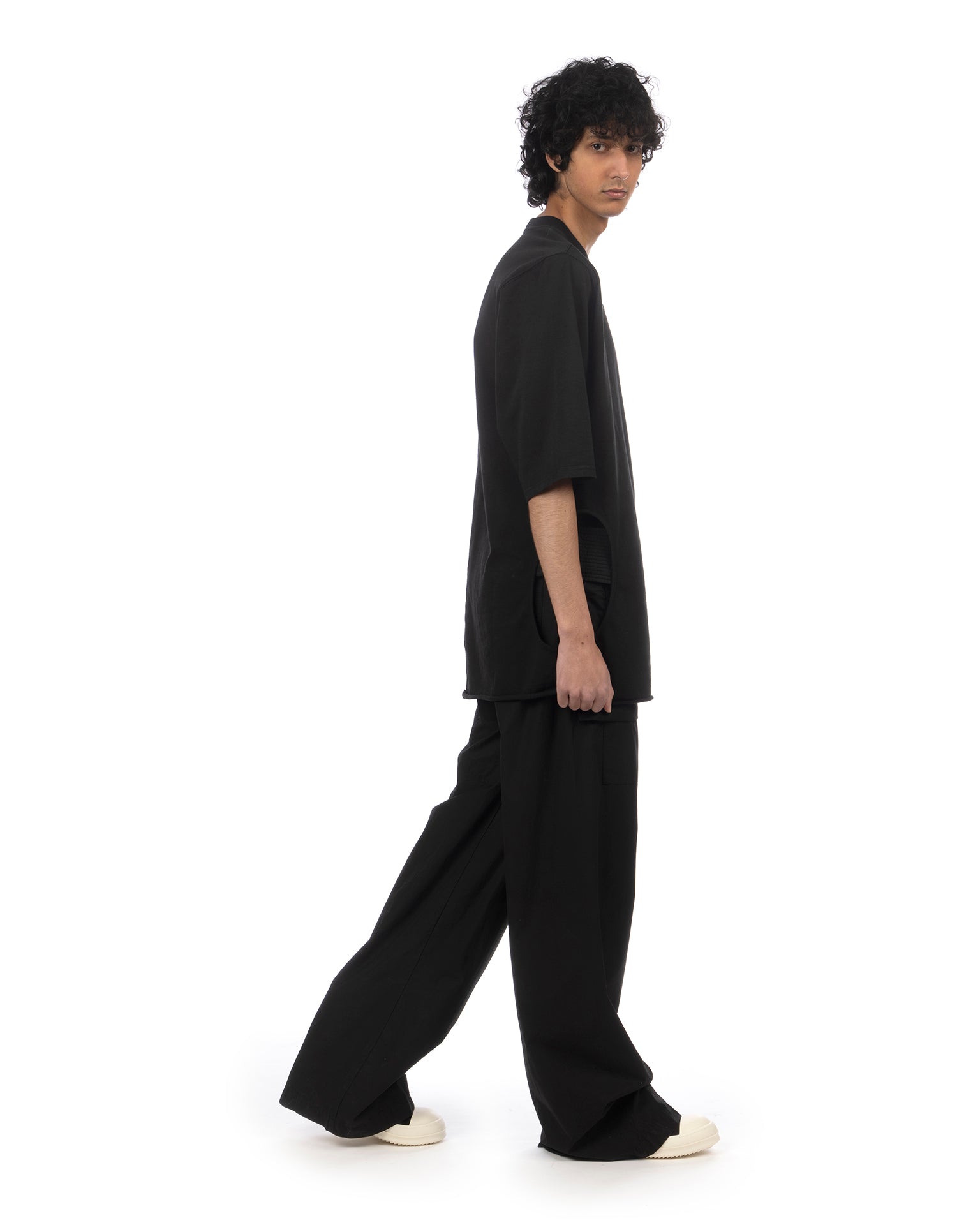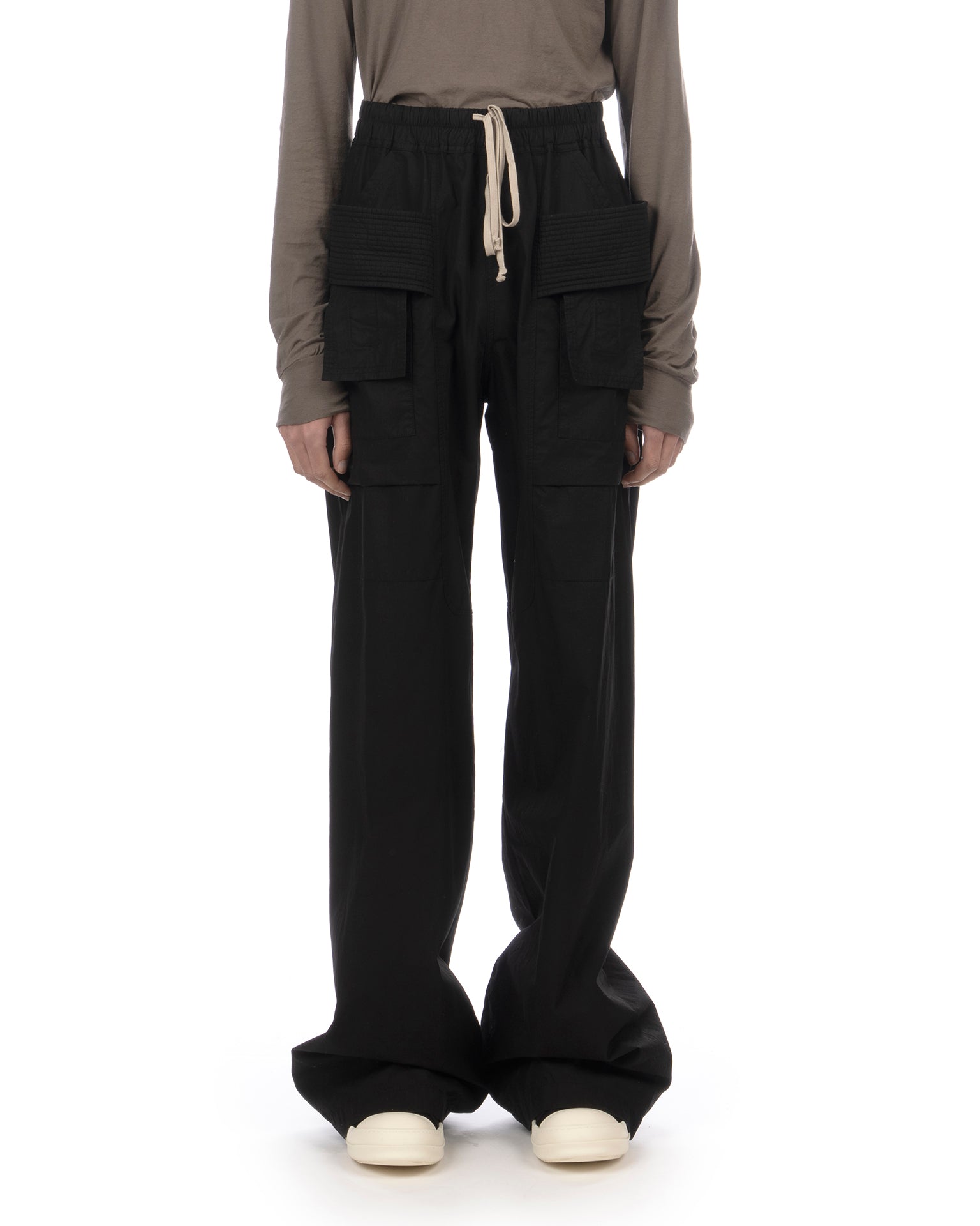 These black wide-leg cargo trousers from DRKSHDW by Rick Owens are cut in a voluminous, floor-grazing silhouette that pools slightly at the ankle. The elasticated waistband is finished with a contrast off-white drawstring. Two oversized flap cargo pockets sit at the front thighs, each reinforced with horizontal pintuck stitching across the pocket face. Additional side seam pockets are visible at the hip. Constructed in 100% cotton, the fabric carries a lightweight, slightly crisp hand. Made in Italy. Part of the SS26 Temple collection, designed around Owens' own ethos of "tough clothes for tough times."