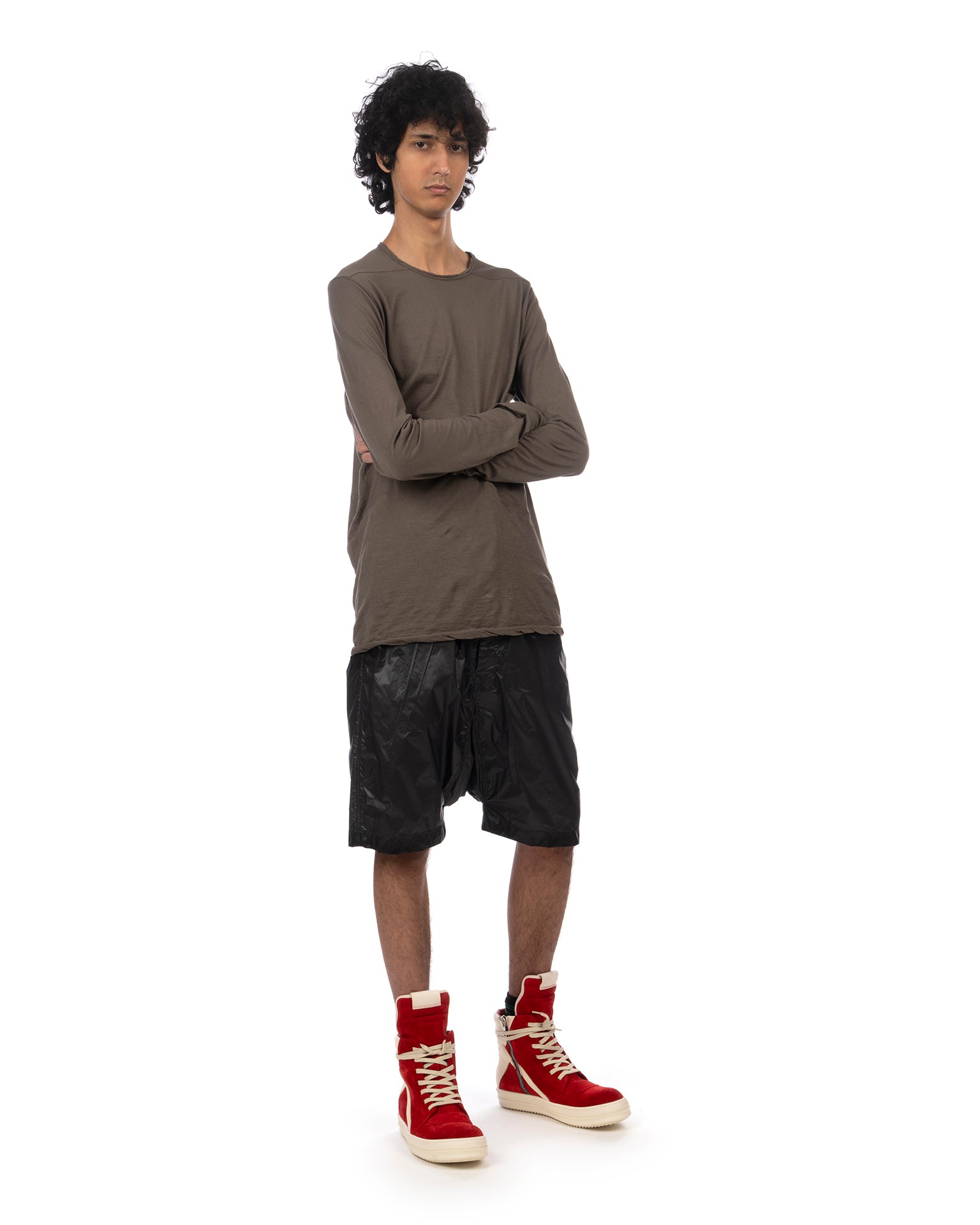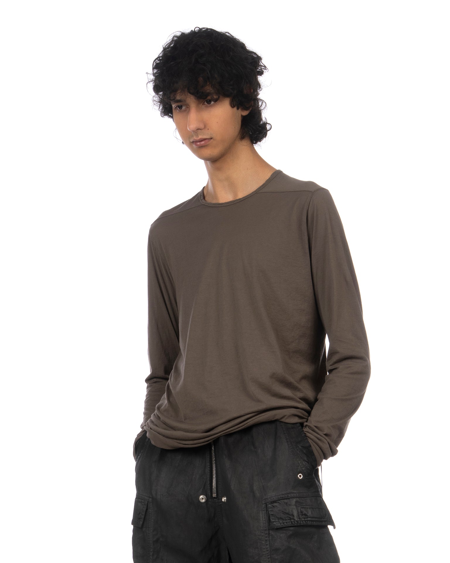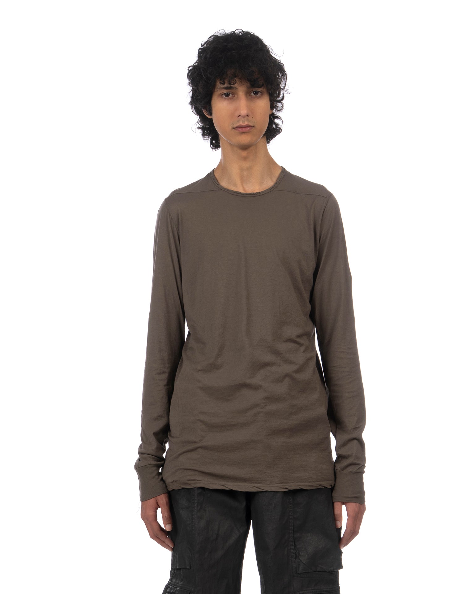 The DRKSHDW by Rick Owens Level Long Sleeve T-shirt in Dust is a foundational long-sleeve tee cut in a relaxed, elongated silhouette that falls past the hip. The crew neck sits close to the base of the throat with a fine raw-edge finish, echoed at the cuffs and hem - a deliberate construction choice rather than an oversight. The slim-fitted sleeves taper toward the wrist, and the extended body length creates a layering-ready proportion. Made in Italy from 100% cotton in a lightweight, fine-gauge jersey that drapes with a fluid quality, the muted dust colorway sits firmly within the introspective, monochrome palette of the SS26 Temple collection.