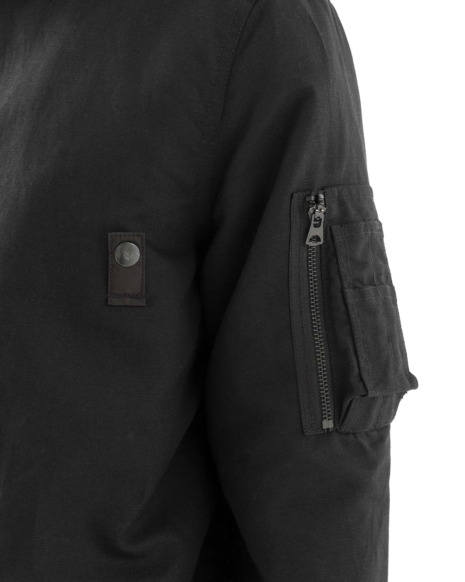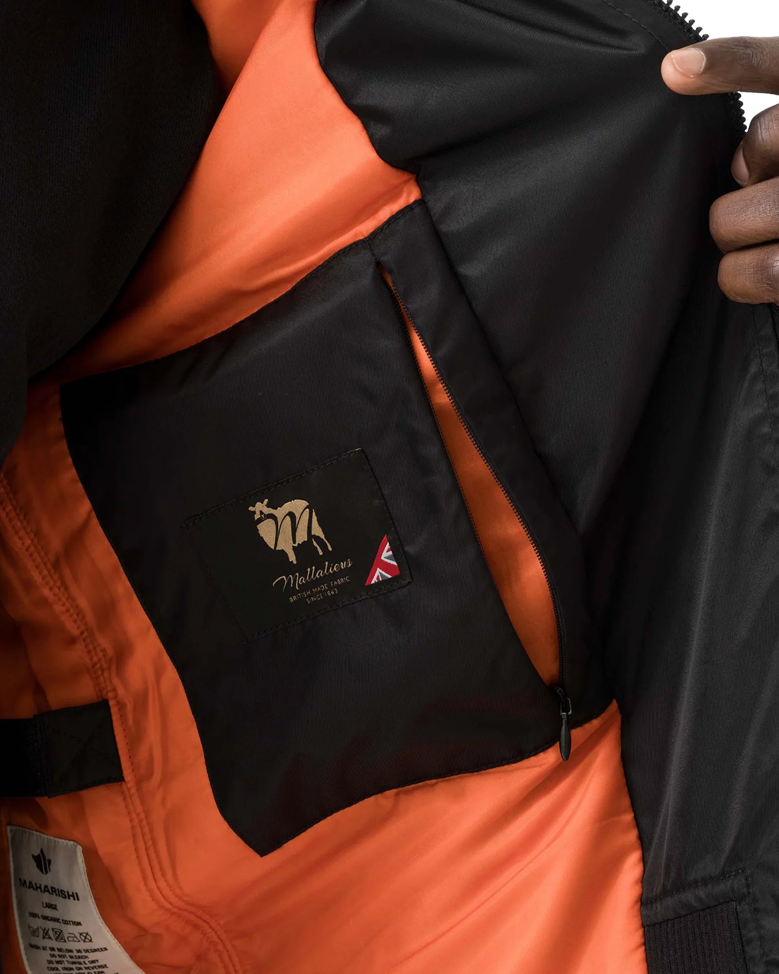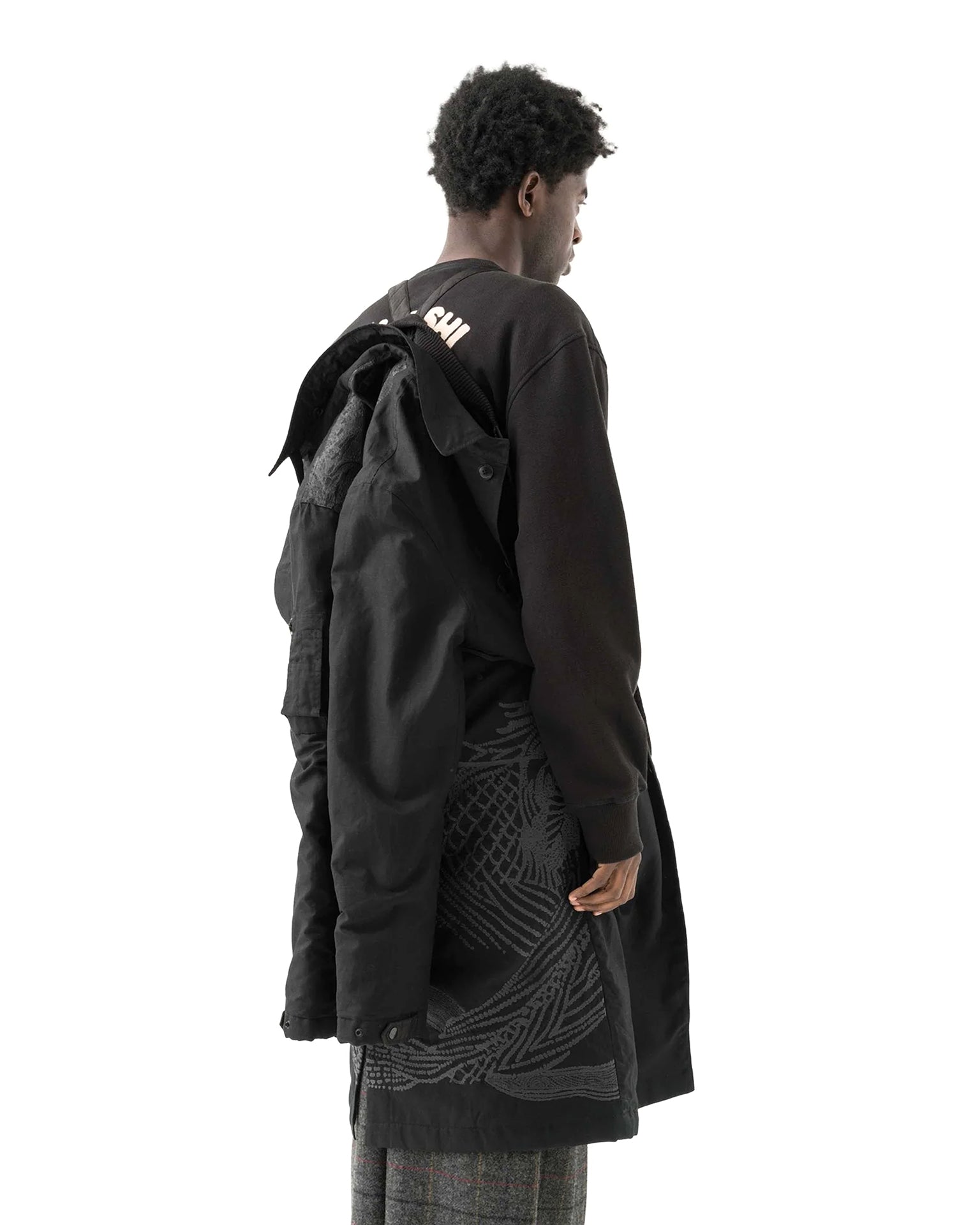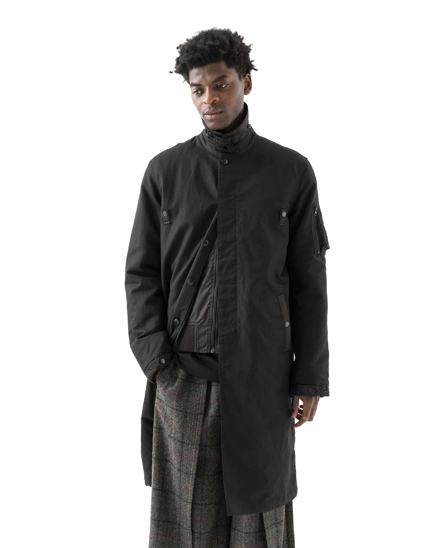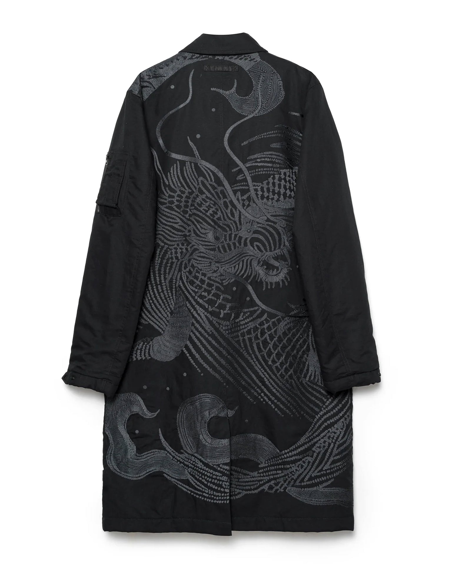 Long single-breasted MA Mac coat in black, fitted with an internal MA-1 flight jacket. The outer shell features Linear Snow Dragon embroidery on reverse and is constructed from a water-resistant cotton hemp. The inner MA-1 is fitted with zip closure, internal carry straps and hi-vis orange lining.