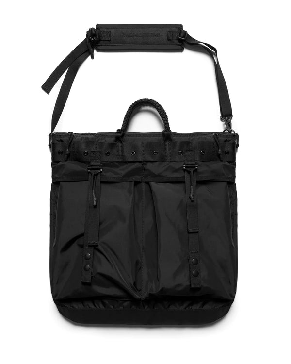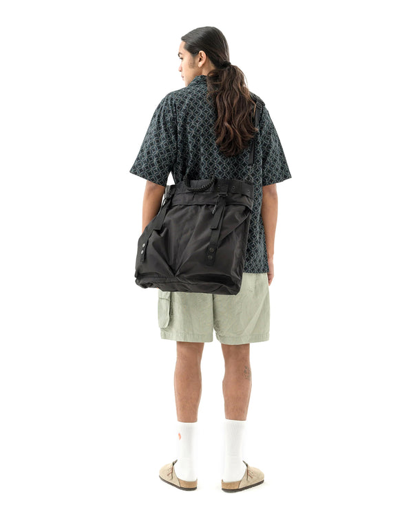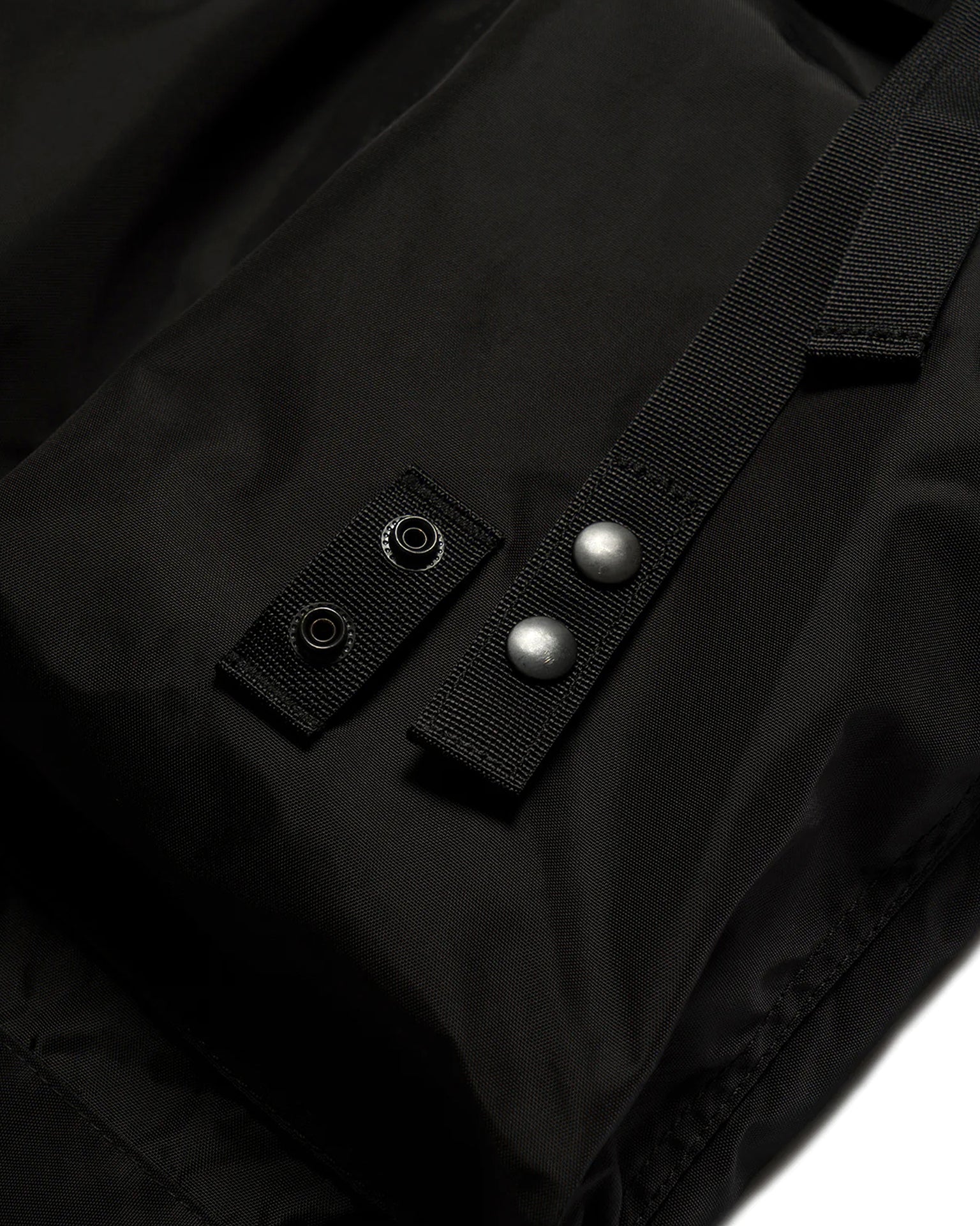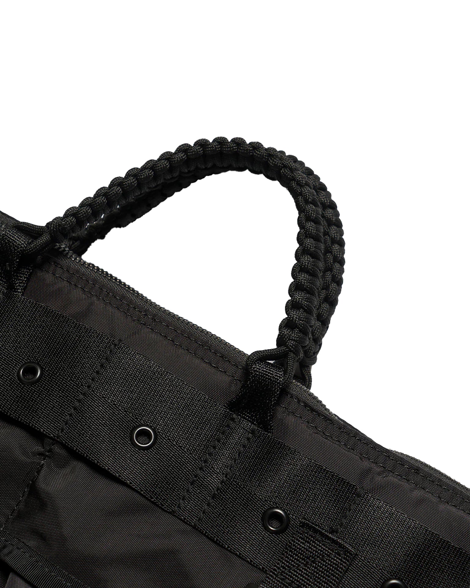U.S. Army inspired large technical tote bag with two large front pockets and a detachable, padded strap. Main compartment features a suspended laptop sleeve, two internal slip pockets and quilted lining. Crafted of midweight Japanese nylon and reinforced with webbing trims.