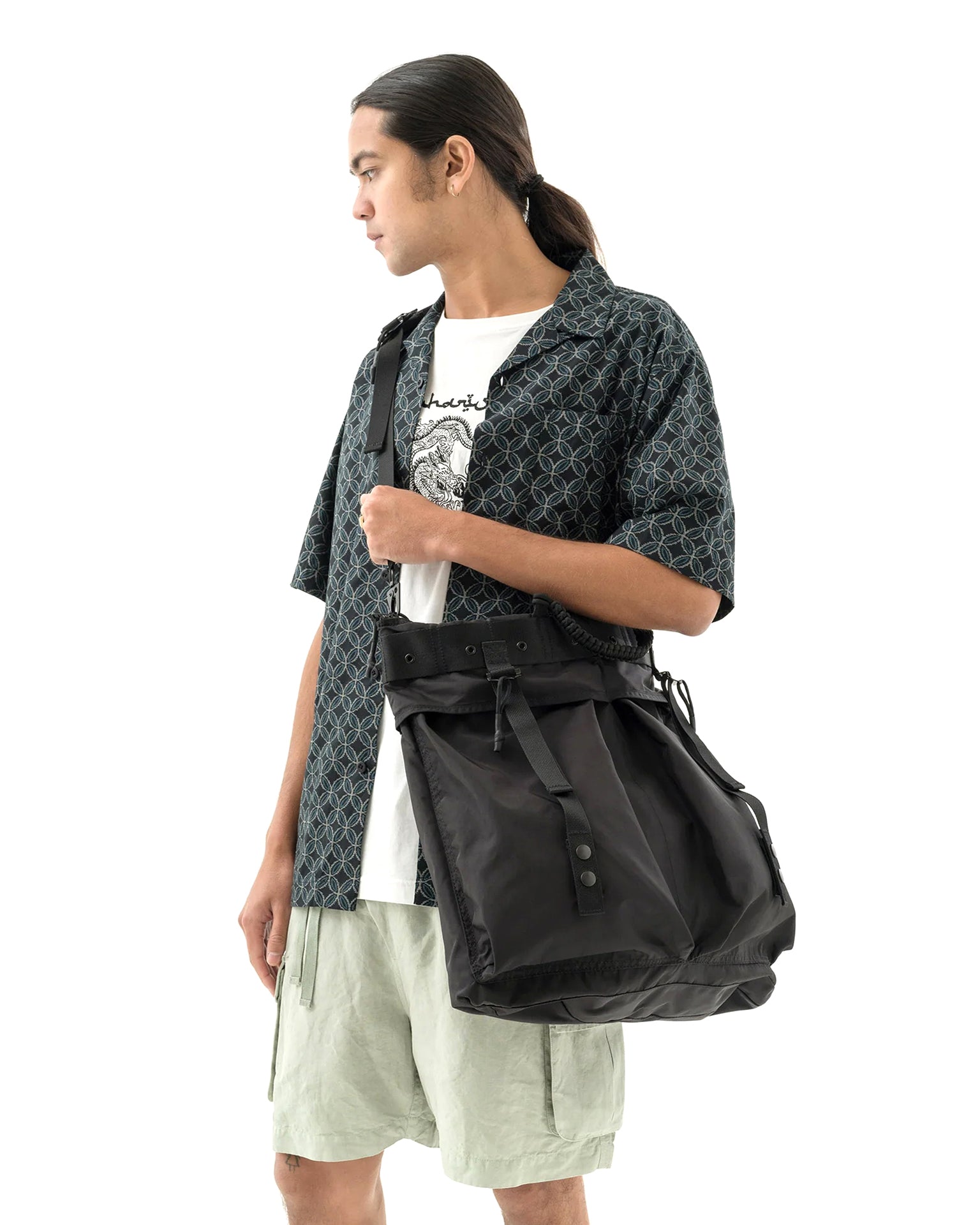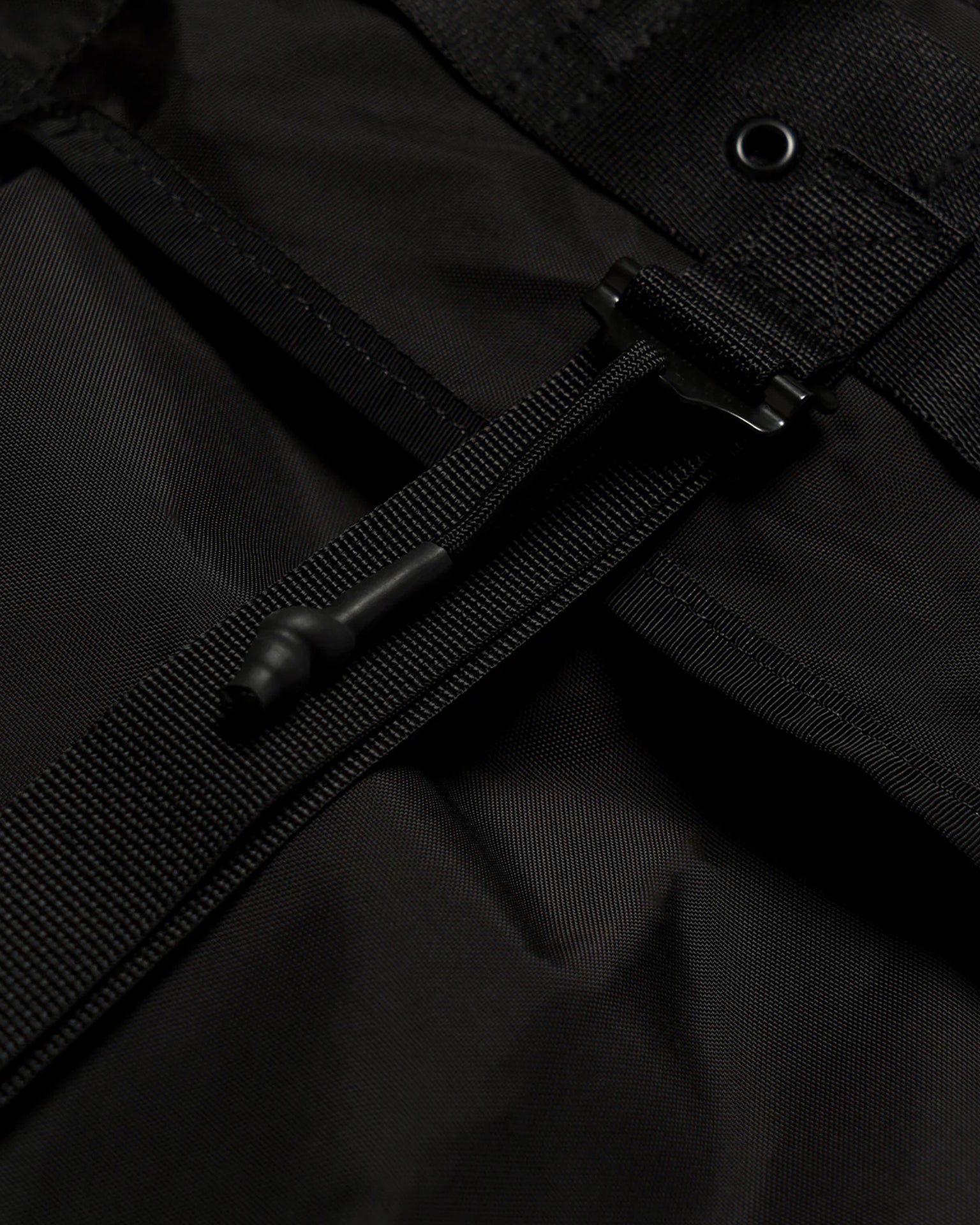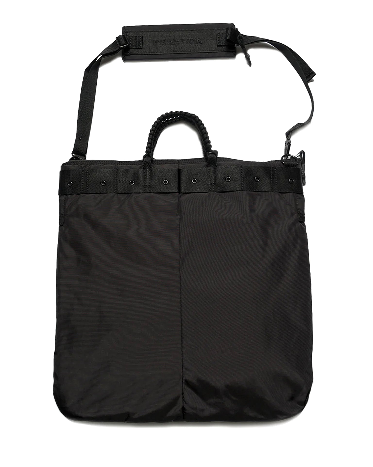 U.S. Army inspired large technical tote bag with two large front pockets and a detachable, padded strap. Main compartment features a suspended laptop sleeve, two internal slip pockets and quilted lining. Crafted of midweight Japanese nylon and reinforced with webbing trims.
