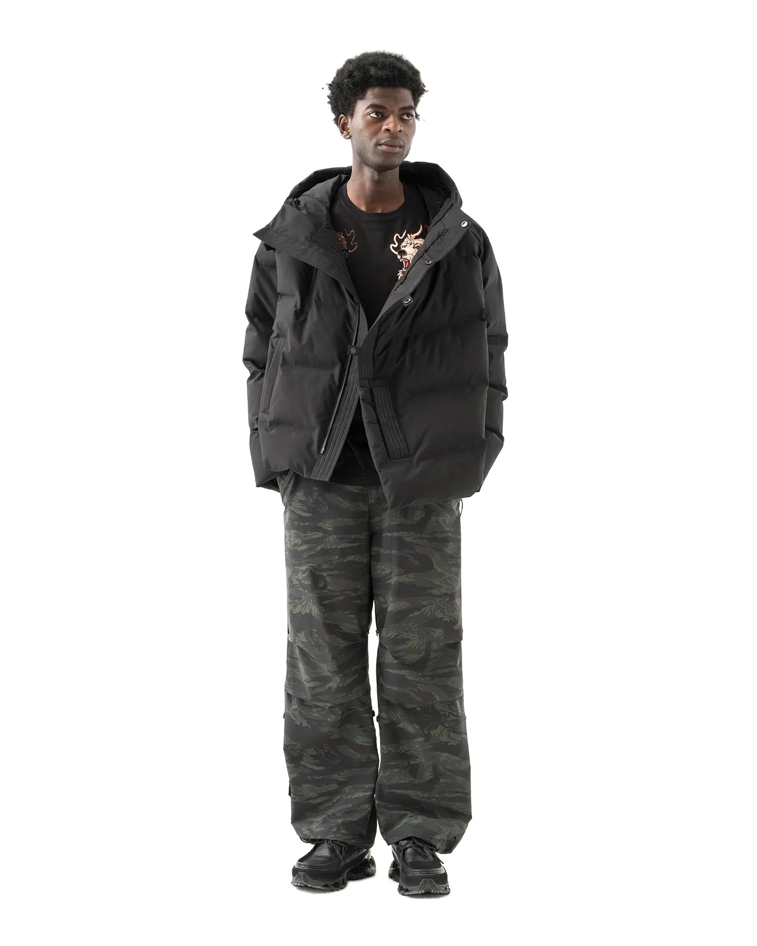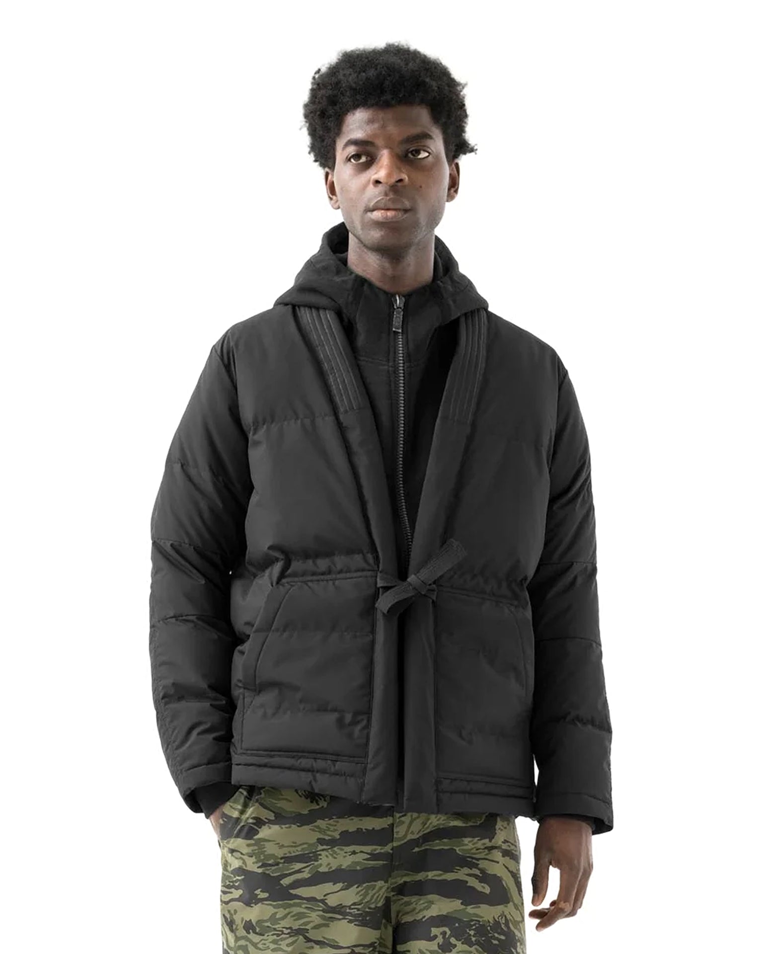 The Padded Hanten Jacket is generously filled with Primaloft® insulation and is designed to be an outer or additional layer piece in cooler climates. Secured with a centre waist tie attached to a structured collar, influenced by the traditional Japanese Hanten Kimono. Finished with Maharishi's signature internal carry straps, reflective branding at the hem and press snap fastenings on the cuff for a customisable fit.