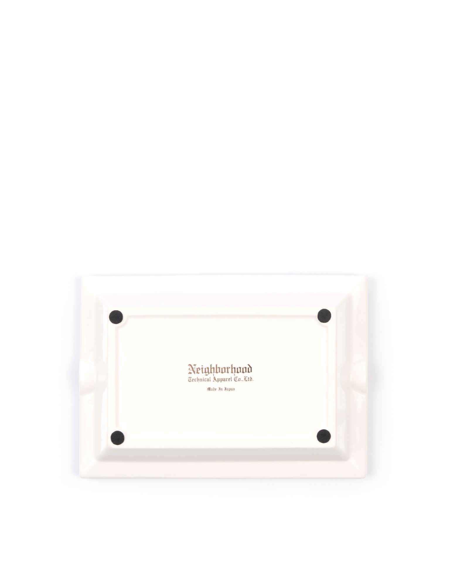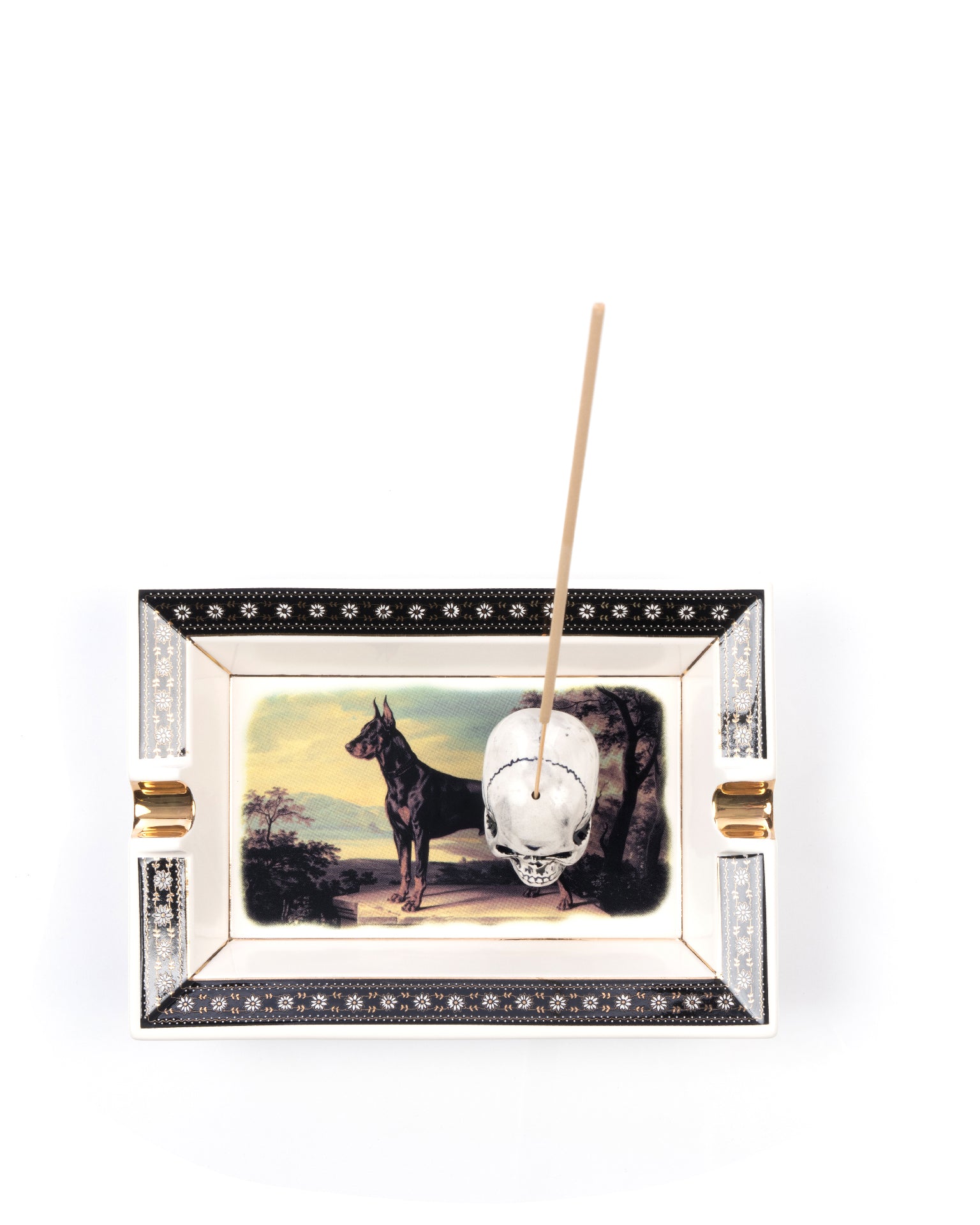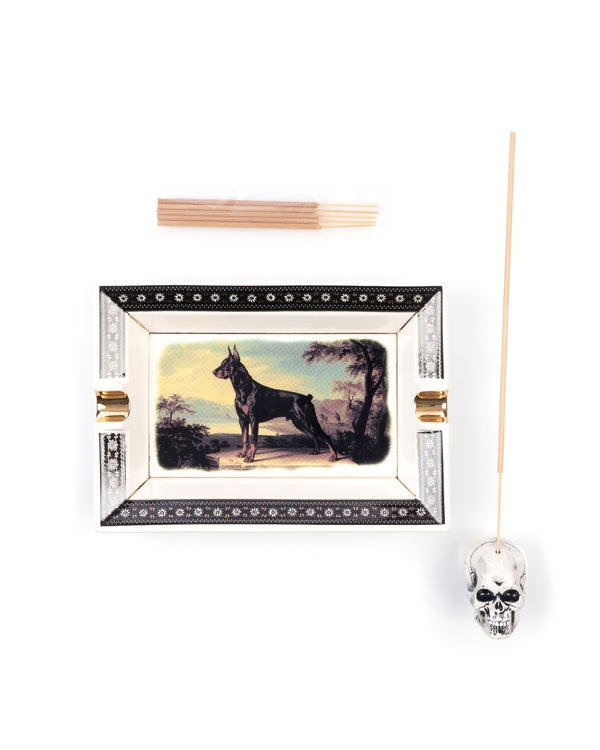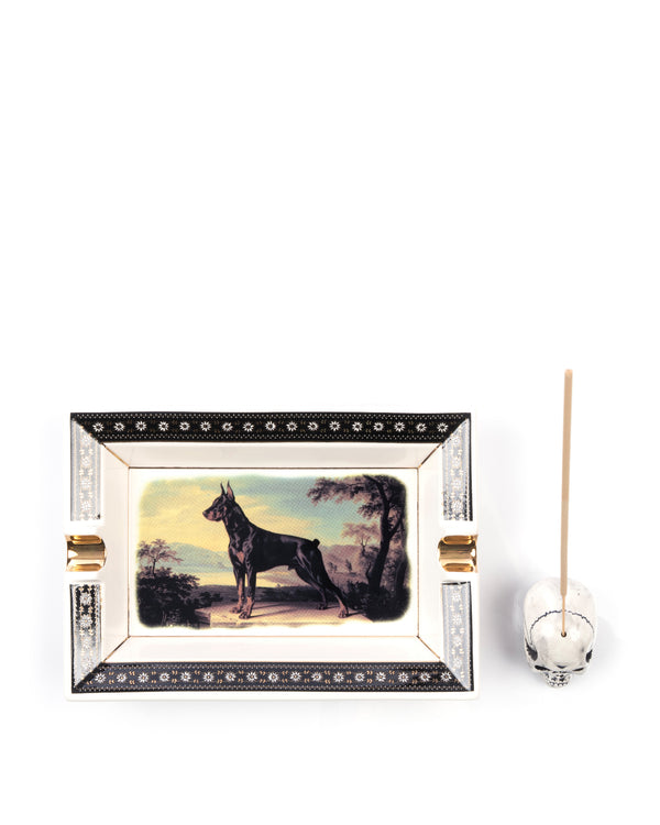 Rectangular incense tray crafted from glossy ceramic, showcasing a detailed central Doberman graphic. It includes a separate, removable porcelain skull incense holder that rests neatly on the tray. The piece is framed with a refined black patterned border and features two gold-tone rests. A discreet printed logo accents the base.