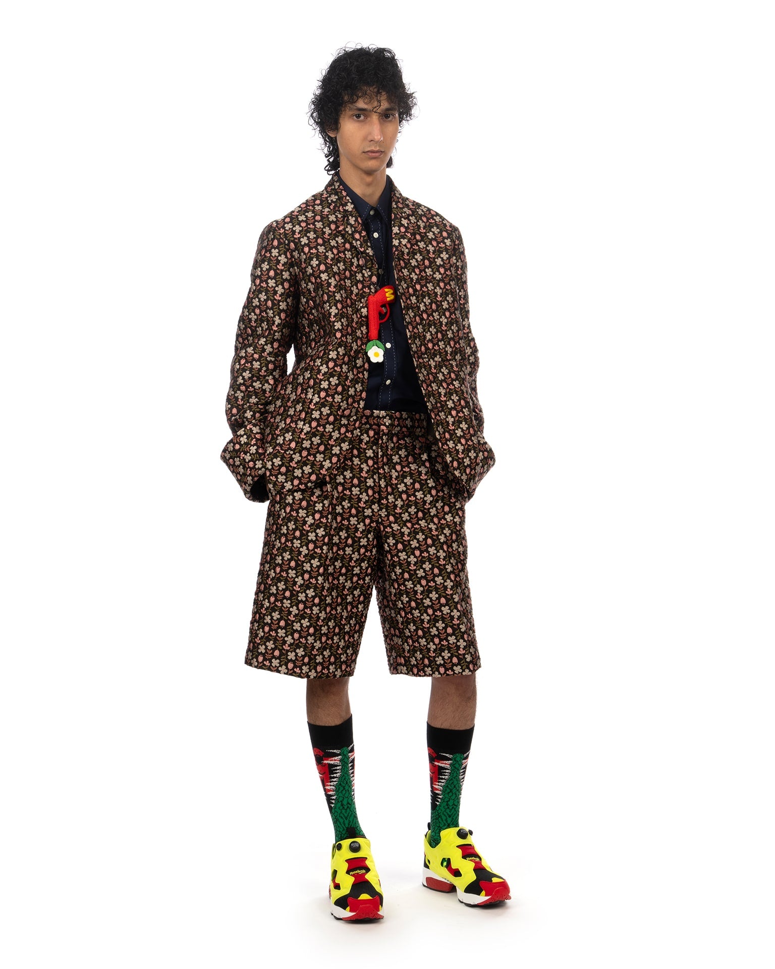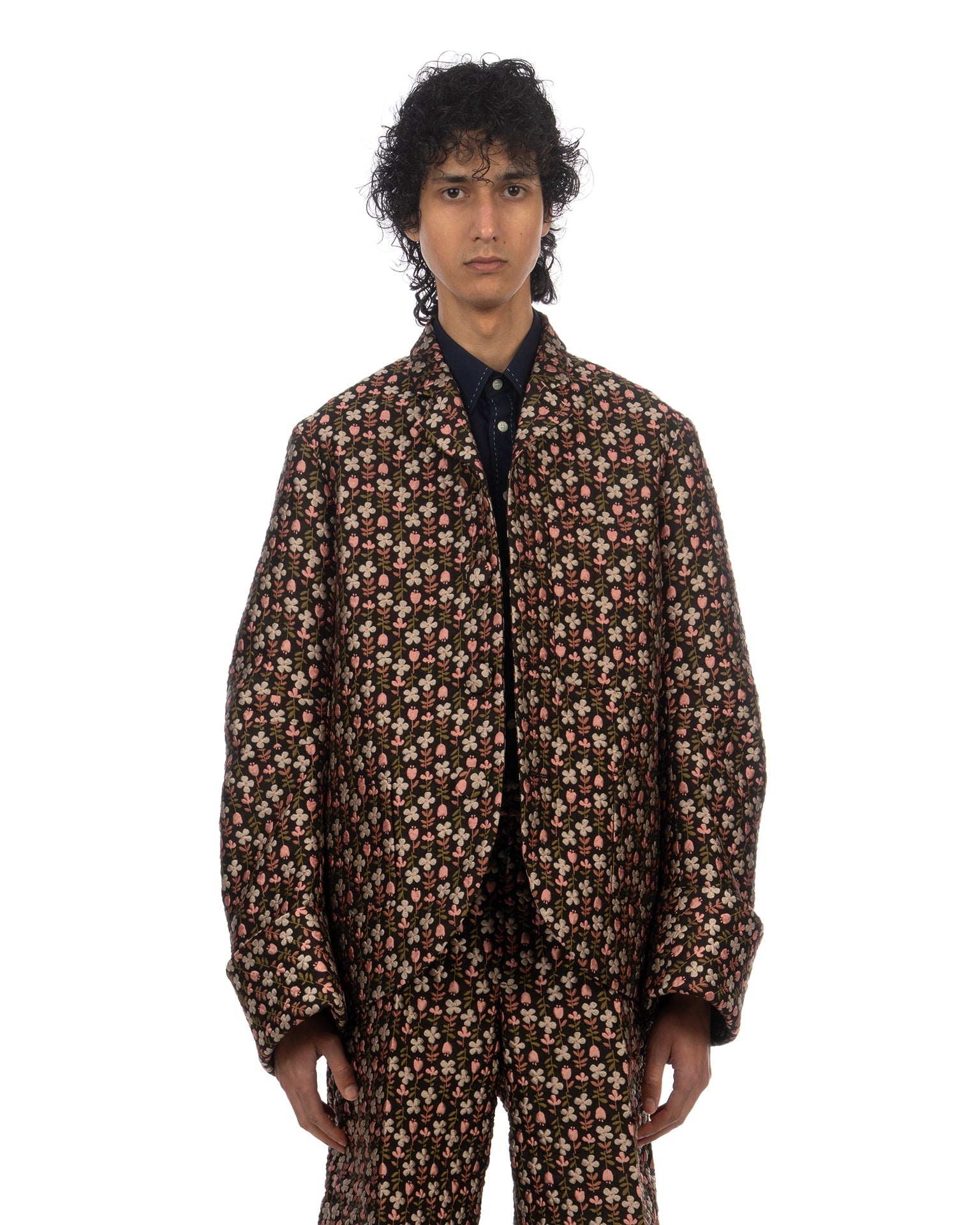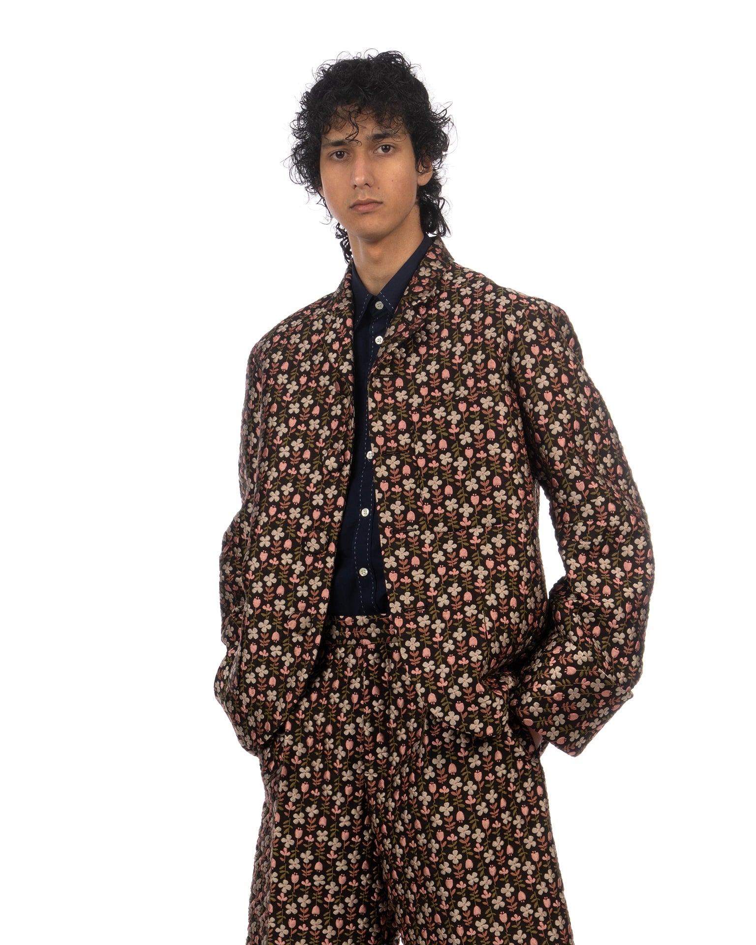 This Walter Van Beirendonck boxy jacket is cut from a structured floral jacquard, woven with an all-over repeating pattern of stylised tulip and clover-like motifs in pink, ecru and olive on a deep black ground. The silhouette is intentionally boxy and oversized through the body, with a dropped shoulder line and full-cut sleeves finished with a wide, turned-up cuff that nods to historical livery tailoring. A short notched lapel collar frames the neckline, while the front closes at the centre with a four-button fastening and a clean overlap. Two symmetrical patched pockets sit at the hips, and the gently rounded front hem falls to hip length. Composed of 63% recycled polyester, 18% polyamide, 11% cotton and 8% polyester, this Italian-made piece sits between sharp tailoring and conceptual outerwear within Walter Van Beirendonck’s SS26 vocabulary.
